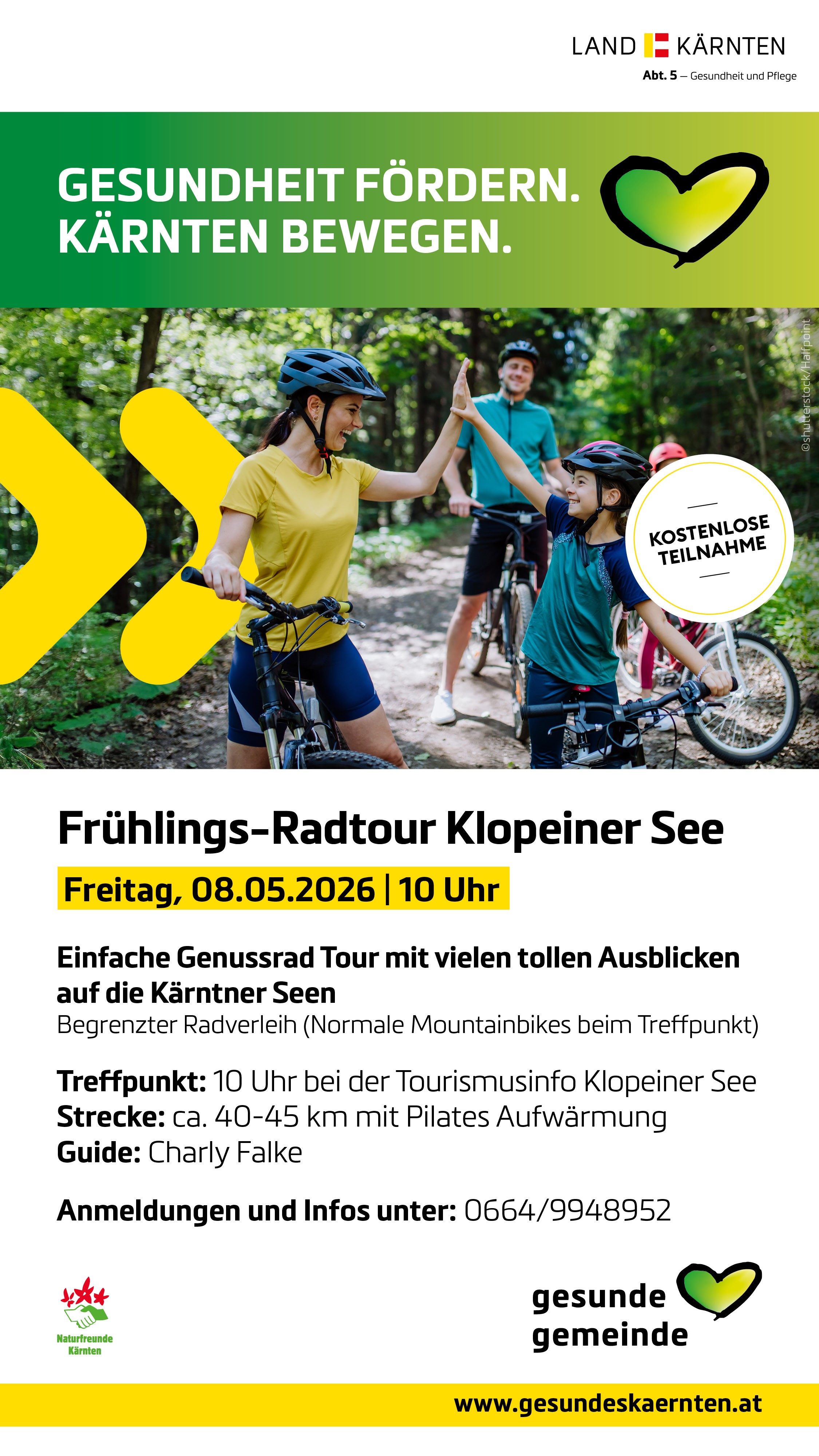 16.04.2026 –Im Rahmen des Projektes „Gesundheit fördern – Kärnten bewegen“ werden auch heuer wieder Radausfahrten mit dem Guide Charly Falke angeboten, welche für alle Teilnehmer:innen kostenlos sind.